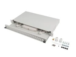 Przełącznica światłowodowa wysuwana z akcesoriami montażowymi o wysokości 1U to produkt przeznaczony do montażu wewnątrz szaf teleinformatycznych o szerokości 19". Wykonana została w całości z wytrzymałej blachy stalowej lakierowanej proszkowo.