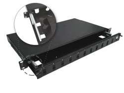 Panel światłowodowy z wysuwalną tacką na stabilnych prowadnicach teleskopowych do montażu w szafach i stojakach 19", 12 portów SC duplex / 12 portów LC quad, kolor czarny.