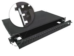 Panel światłowodowy z wysuwalną tacką na prowadnicach teleskopowych do montażu w szafach i stojakach 19", 24 porty SC duplex / 24 porty LC quad, kolor czarny.