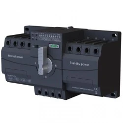 Przełącznik automatyczny służy do przełączania automatycznego i manualnego pomiędzy dwoma 3-fazowymi liniami zasilającymi lub np. linią zasilającą, a generatorem. Obsługiwany prąd do 63A.