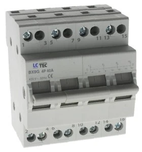 Prezentowany produkt to przełącznik modułowy serii BX9G marki LC TEC. Służy do wyboru źródła zasilania lub wyboru obwodu elektrycznego albo ich całkowitego odłączania.