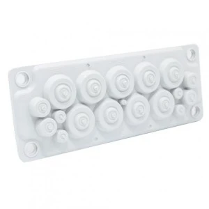 Przepust dławiący HTB-17 w kolorze szarym to specjalny przepust z tworzywa sztucznego z tłoczonym wzmocnieniem staowym i wstępnie przygotowanymi przepustami kablowymi o kompaktowej konstrukcji. Przeznaczony do przewodów o średnicy od 5 mm2 do 30 mm2. Maksymalna ilość podłączonych kabli wynosi 17. Zakres temperatury pracy od -40 °C do +100°C. Przepust dławiący posiada stopień ochrony IP 55.