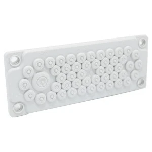 Przepust dławiący HTB-50 w kolorze szarym to specjalny przepust z tworzywa sztucznego z tłoczonym wzmocnieniem staowym i wstępnie przygotowanymi przepustami kablowymi o kompaktowej konstrukcji. Przeznaczony do przewodów o średnicy od 7 mm2 do 25 mm2. Maksymalna ilość podłączonych kabli wynosi 50. Zakres temperatury pracy od -40 °C do +100°C. Przepust dławiący posiada stopień ochrony IP 65.