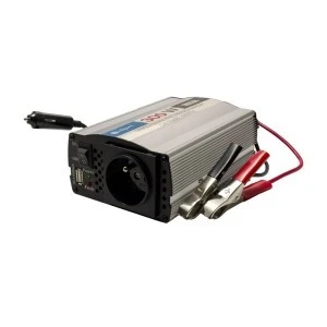 Przetwornica napięcia samochodowa 300 W. Umożliwia podłączenie urządeń zasilanych prądem zmiennym AC do gniazda zapalniczki samochodowej lub akumulatora samochodowego. Przetwarza napięcie stałe DC 12 V na napięcie zmienne AC 230 V. Gniazdo USB (max. 1 A) do ładowania urządeń mobilnych. Moc ciągła: 300 W. Moc chwilowa: 600 W. Napięcie wejściowe: DC 10-15 V. Napięcie wyjściowe: AC 230 V. Pobór prądu: 350 mA. Zabezpieczenia: termiczne, przeciążeniowe, przeciwprzepięciowe (bezpiecznik 40 A). Przewód z wtykiem gniazda zapalniczki: 0,8 m przewód do podłączenia do akumulatora: 0,9 m. Stopień ochrony: IP20.