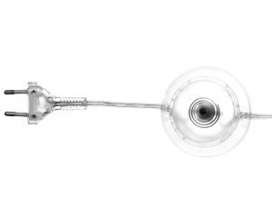 Przewód H03VVH2-F 2 x 0,75 mm2, o długości 200 cm,płaska wtyczka i łącznik nożny 2,5 A / 250 V AC z tworzywa sztucznego zamontowany 50 cm od końca przewodu.Opakowanie: woreczek z zawieszką. Kolor bezbarwny.