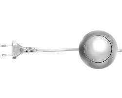 Przewód H03VVH2-F 2 x 0,75 mm2, o długości 200 cm,płaska wtyczka i łącznik nożny 2,5 A / 250 V AC z tworzywa sztucznego zamontowany 50 cm od końca przewodu.Opakowanie: woreczek z zawieszką. Kolor srebrny.