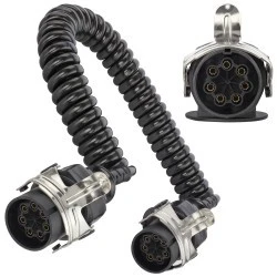 Wysokiej jakości spiralny przewód samochodowy, zakończony wtyczkami 7-pinowymi typu N, stosowany do połączenia instalacji elektrycznej 24V pomiędzy ciągnikiem, a naczepą lub przyczepą o dużej ładowności. Zapewnia stałe połączenie gwarantując nieprzerwane działanie dostępnych funkcji (np. oświetlenia).