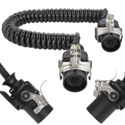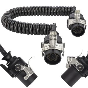 Wysokiej jakości spiralny przewód samochodowy, zakończony wtyczkami 7-pinowymi, stosowany do podłączenia systemu EBS/ABS pomiędzy ciągnikiem, a naczepą lub przyczepą o dużej ładowności. Zapewnia stałe połączenie instalacji 24V gwarantując nieprzerwane działanie EBS/ABS podczas jazdy.