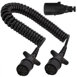 Wysokiej jakości spiralny przewód samochodowy, zakończony wtyczkami 7-pinowymi typu N, stosowany do połączenia instalacji elektrycznej 24V pomiędzy ciągnikiem, a naczepą lub przyczepą o dużej ładowności. Zapewnia stałe połączenie gwarantując nieprzerwane działanie dostępnych funkcji (np. oświetlenia).