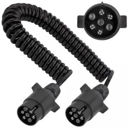 Wysokiej jakości spiralny przewód samochodowy, zakończony uniwersalnymi wtyczkami 7-pinowymi, stosowany do połączenia instalacji elektrycznej 12V pomiędzy pojazdem ciągnącym, a przyczepą, przyczepką lub lawetą. Zapewnia stałe połączenie gwarantując nieprzerwane działanie świateł podczas jazdy.