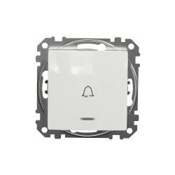 Przycisk 1-biegunowy "dzwonek" z podświetleniem, biały, to osprzęt serii Sedna Design & Elements marki Schneider Electric. Przycisk 1-biegunowy ma lśniące wykończenie powierzchni w kolorze białym i posiada następujące wymiary: szerokość 73 mm, wysokość 73 mm, głębokość 37 mm, głębokość wystawania 24 mm. Długość izolacji zdejmowanej z kabla to 13 mm. Przycisk charakteryzuje się stopniem ochrony IP20 i zakresem mocy wynoszącym 2300 W. Do produkcji przycisku wykorzystano tworzywo termoplastyczne o zwiększonej odporności na promieniowanie UV. Produkt jest montowany podtynkowo i posiada zaciski bezśrubowe. Uwaga: produkty Sedna Design & Elements nie są kompatybilne z serią Sedna!