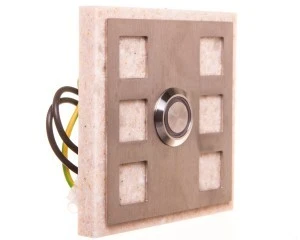 Przycisk podtynkowy,przystosowany do montażu w puszcze O 60 mm,niebieskie podświetlenie przycisku,obudowa z wysoko wytrzymałego materiału imitującego kamień naturalny (kolor beżowy),przeznaczony do instalacji dzwonkowej i domofonowej,możliwość sterowania zamka elektro-magnetycznego lub innych urządzeń niskiego napięcia (do 250 V AC),przycisk nieprzystosowany do pracy w zmiennych warunkach atmosferycznych,dostępny w opakowaniu jednostkowym (blister).