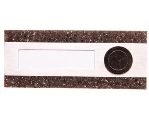 Przycisk natynkowy z wizytówką,obudowa z wysoko wytrzymałego materiału imitującego kamień naturalny (kolor brązowy),przeznaczony do budynku jednoapartamentowego,przeznaczony do instalacji dzwonkowej i domofonowej,możliwość sterowania zamka elektromagnetycznego lub innych urządzeń niskiego napięcia (do 50 V AC),przycisk nieprzystosowany do pracy w zmiennych warunkach atmosferycznych,dostępny w opakowaniu jednostkowym (blister).