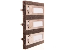Przycisk natynkowy z wizytówką,obudowa z wysoko wytrzymałego materiału imitującego kamień naturalny (kolor brązowy), przeznaczony do budynku trzyapartamentowego,przeznaczony do instalacji dzwonkowej i domofonowej,możliwość sterowania zamka elektromagnetycznego lub innych urządzeń niskiego napięcia (do 50 V AC),przycisk nieprzystosowany do pracy w zmiennych warunkach atmosferycznych,dostępny w opakowaniu jednostkowym (blister).