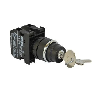 Przycisk kluczykowy serii B. Korpus z tworzywa. Kluczyk wyciągany w pozycji 0, 2NO, niestabilny, II->0<-I.