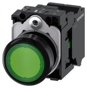 Przycisk okrągły podświetlany, 22 mm, plastik, zielony, przycisk, płaski, ze stykiem chwilowym, z uchwytem, 3SU1102‑0AB40‑3BA0