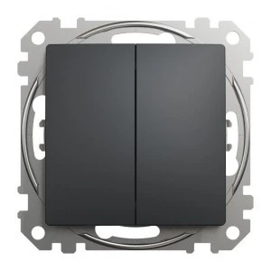 Przycisk podwójny, czarny antracyt, to osprzęt serii Sedna Design & Elements marki Schneider Electric. Przycisk podwójny ma malowane wykończenie powierzchni w kolorze czarnego antracytu i posiada następujące wymiary: szerokość 73 mm, wysokość 73 mm, głębokość 37 mm, głębokość wystawania 24 mm. Długość izolacji zdejmowanej z kabla to 13 mm. Przycisk charakteryzuje się stopniem ochrony IP20 i zakresem mocy wynoszącym 2300 W. Do produkcji przycisku wykorzystano tworzywo termoplastyczne o zwiększonej odporności na promieniowanie UV. Produkt jest montowany podtynkowo i posiada zaciski bezśrubowe. Uwaga: produkty Sedna Design & Elements nie są kompatybilne z serią Sedna!