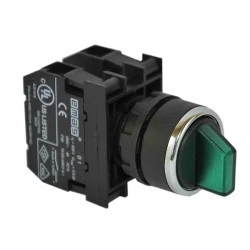 Przycisk pokrętny serii B. Korpus z tworzywa. 2NO, niestabilny, II->0<-I, zielony, możliwość podświetlenia poprzez dołączenie elementu podświetlającego T0-B*, *kolor, zasilanie 100-230V AC lub 12-30V AC/DC.