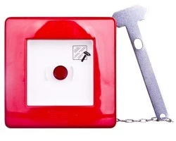 Uruchomienie systemu sygnalizacji pożarowej za pomocą przycisku przeciwpożarowego polega na zbiciu szklanego okienka, co powoduje zwolnienie przycisku lub zbiciu okienka i wciśnięcia przycisku alarmowego. Zbicie szybki może odbywać się za pomocą specjalnego młoteczka, tak jak w tym przypadku. Produkt posiada obudowę wykonaną z tworzywa sztucznego. Jest wyposażony w szklane okienko. Wymiary produkty wynoszą: głębokość 50 mm, wysokość i szerokość wynoszą 120 mm.