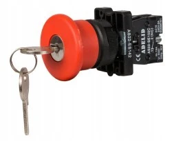 Przycisk sterowniczy awaryjny, wyłącznik bistabilny o średnicy grzybka 40mm w kolorze czerwonym został wykonany z metalu. Jest on blokowany poprzez wciśnięcie grzybka i odryglowany poprzez obrót klucza. Możliwość rozbudowy o dodatkowe styki.
