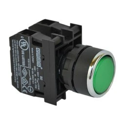 Przycisk sterowniczy serii B z tworzywa, kryty, niestabilny, zielony, możliwość podświetlenia poprzez dołączenie elementu podświetlającego T0-B*, *kolor, zasilanie 100-230V AC lub 12-30V AC/DC.