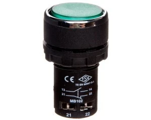 Przycisk sterowniczy serii MB – monoblok z tworzywa, kryty, niestabilny, wyposażony w styki 1NO+1NC. Kolor zielony.