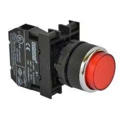 Przycisk sterowniczy serii B z tworzywa, wystający, niestabilny, możliwość podświetlenia poprzez dołączenie elementu podświetlającego T0-B*, *kolor, zasilanie 100-230V AC lub 12-30V AC/DC.