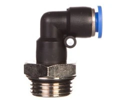 Przyłączka kątowa wtykowa tworzywowa do przewodów sztucznych. Gwint: G1/2. Średnica przewodu: D8. Przyłączki do przewodów z tworzyw sztucznych wtykowe są stosowane do łączenia instalacji pneumatycznych oraz do podłączania elementów pneumatyki. Prosta konstrukcja i wysoka jakość wykonania oraz uszczelnienia gwarantują łatwe, szybkie i szczelne łączenie przewodów. Do przyłączek są stosowane przewody wykonane z następujących rodzajów tworzyw sztucznych: -poliamidu, -polietylenu, -PVC, -RILSANU, -poliuretanu. Zakres temperatur pracy: -18 do + 70°C. Maksymalne ciśnienie pracy: 1,5 MPa.