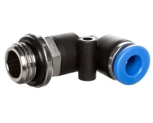 Przyłączka kątowa wtykowa tworzywowa do przewodów sztucznych. Gwint: G1/4. Średnica przewodu: D6. Przyłączki do przewodów z tworzyw sztucznych wtykowe są stosowane do łączenia instalacji pneumatycznych oraz do podłączania elementów pneumatyki. Prosta konstrukcja i wysoka jakość wykonania oraz uszczelnienia gwarantują łatwe, szybkie i szczelne łączenie przewodów. Do przyłączek są stosowane przewody wykonane z następujących rodzajów tworzyw sztucznych: -poliamidu, -polietylenu, -PVC, -RILSANU, -poliuretanu. Zakres temperatur pracy: -18 do + 70°C. Maksymalne ciśnienie pracy: 1,5 MPa.