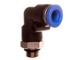 Przyłączka kątowa wtykowa tworzywowa do przewodów sztucznych. Gwint: G1/8. Średnica przewodu: D8. Przyłączki do przewodów z tworzyw sztucznych wtykowe są stosowane do łączenia instalacji pneumatycznych oraz do podłączania elementów pneumatyki. Prosta konstrukcja i wysoka jakość wykonania oraz uszczelnienia gwarantują łatwe, szybkie i szczelne łączenie przewodów. Do przyłączek są stosowane przewody wykonane z następujących rodzajów tworzyw sztucznych: -poliamidu, -polietylenu, -PVC, -RILSANU, -poliuretanu. Zakres temperatur pracy: -18 do + 70°C. Maksymalne ciśnienie pracy: 1,5 MPa.