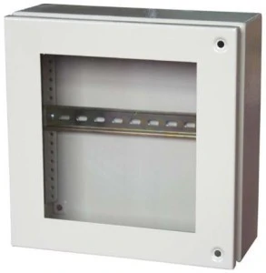 Stalowa skrzynka ścienna IP65 z okienkiem. Skrzynka ścienna IP65 Drzwi skrzydłowe i szyba Obudowa posiada pokrywę z uszczelką uszczelniającą i akcesoriami mocującymi Stal miękka Grubość ścianki 1,4 mm Szary RAL 7032