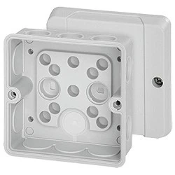 Puszka instalacyjna natynkowa HENSEL o wymiarach 88x88x50 mm to hermetyczna obudowa, zapewniająca wysoki stopień ochrony IP55, co gwarantuje jej odporność na pył i wodę, idealną do wymagających warunków instalacyjnych.