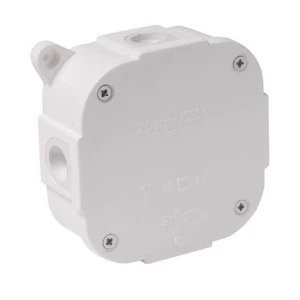 Puszka instalacyjna przeznaczona do montażu natynkowego w kolorze białym o wymiarach 88 × 88 × 40 mm.