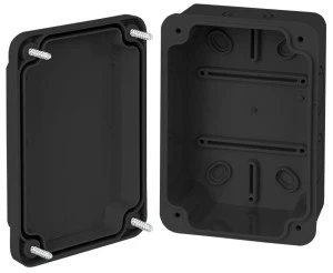 Puszka z tworzywa ABS, z przetłoczeniami, wykonana z bardzo wytrzymałego materiału, do montażu natynkowego, w kolorze czarnym.