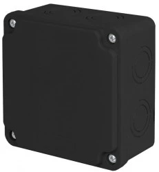 Puszka z tworzywa ABS, z przetłoczeniami, wykonana z bardzo wytrzymałego materiału, do montażu natynkowego, w kolorze czarnym.