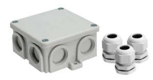 Puszka natynkowa szara RAL 7035, z 3 dławikami PG16, wykonana z bakelitu. IP54, 500V, 7 wpustów.
