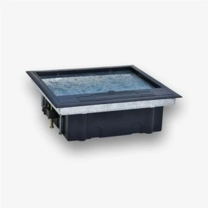 Puszka podłogowa (ramka) do instalacji osprzętu w standardzie 45x45 (gniazda elektryczne, teletechniczne i in.). Puszka przeznaczona do stosowania w podłogach technicznych lub betonie (z wykorzystaniem opcjonalnej obudowy do betonu). Pokrywa przystosowana do wklejenia wykładziny dywanowej lub płyty HDF grubości do 7 mm, uchwyty montażowe do płyt podłogi technicznej o grubości maksymalnej 40 mm. Pojemność puszki 12 modułów 22,5x45 (6 modułów 45x45 ). Umożliwiają przygotowanie estetycznego punktu abonenckiego teletechnicznego wraz z siecią elektryczną. Ramka z gniazdem uchylna, pozwalająca zmienić kąt przyłączenia wtyku z przewodem w granicach do 45 st. Puszka posiada osłabienia boczne do wprowadzenia przewodów i płynną regulację głębokości za pomocą śrub. Pokrywa posiada uchylne wyprowadzenie przewodów dołączanych do gniazd i zabezpieczenie przed uszkodzeniem kabli. Umożliwia obniżenie płaszczyzny montażowej gniazd.