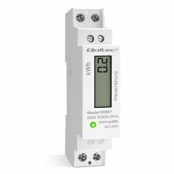 Elektroniczny miernik zużycia energii do montażu na szynie DIN TH35 służy do bieżącej kontroli poziomu zużycia energii elektrycznej przez odbiorniki jednofazowe. Wyświetlacz LCD wskazuje wartość pobranej energii przeliczonej z liczby impulsów. Pobór energii w fazie sygnalizuje ledowy wskaźnik pomiaru. Licznik jednofazowy, jednokierunkowy, dwuprzewodowy. Klasa dokładności 1.0
