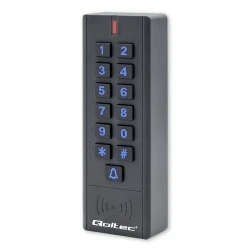 Prezentowany model składa się z podświetlanej cyfrowej klawiatury, dzwonka oraz czytnika kart zbliżeniowych i breloków.