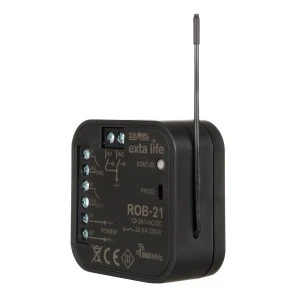 Odbiornik ROB-21 przeznaczony jest do otwierania/zamykania bram wjazdowych lub garażowych z poziomu pilotów oraz aplikacji EXTA LIFE. Odbiornik można również z powodzeniem wykorzystać do sterowania elektrozaczepami w furtach wejściowych na posesję. W przypadku sterowania bramami konieczne jest podłączenie odbiornika pod odpowiednie wejścia dedykowanego sterownika bramy wjazdowej lub garażowej. ROB-21 posiada dwa wejścia do podłączenia czujników krańcowych – dzięki temu w aplikacji widoczny jest faktyczny stan bramy: zamknięta / uchylona / otwarta. Funkcjonalnie tryb sterowania bramą umożliwia całkowite jej otwarcie lub jedynie uchylanie do ustalonego poziomu. Szeroki zakres napięcia zasilającego 12÷24 V AC/DC umożliwia współpracę z większością sterowników bram dostępnych na rynku. Dwa kanały ze stykami NO umożliwiają niezależne sterowanie: bramą i furtką, dwoma bramami lub dwoma furtkami. Wymiary umożliwiają montaż urządzenia w puszkach instalacyjnych Ø60 lub bezpośrednio w obudowie sterownika bramy.