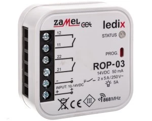 Odbiornik ROP-03 został zaprojektowany z myślą o realizacji prostych funkcji sterowania w instalacjach niskonapięciowych 10÷14 V. Urządzenie to w połączeniu z dowolnym nadajnikiem bezprzewodowego systemu EXTA FREE (www.extafree.pl) umożliwia realizację funkcji załącz / wyłącz, trybu monostabilnego,bistabilnego i czasowego. Odbiornik przeznaczony jest głównie do stosowania w układach sterowania oświetleniem diodowym. ROP-03 posiada dwa beznapięciowe wyjścia przekaźnikowe typu NO o maksymalnej obciążalności 5 A, a niewielkie wymiary obudowy umożliwiają bezpośredni montaż urządzenia w puszce ?=60 mm. Produkt należy do grupy ECOLINE charakteryzującej urządzenia o niskim poborze mocy.