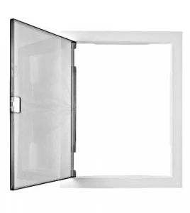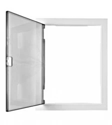 Przezroczyste drzwiczki, do obudów naściennych 2-rzędowych BK0850012A (ściana murowana) i BK0850512A (ściana g/k), w komplecie zaciski śrubowe, ABS, bezhalogenowe, klasa II, kolor ramki RAL9003