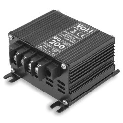 Elektroniczna przetwornica DC-PRO-200 to nowoczesne i bezzakłóceniowe urządzenie przeznaczone do obniżania napięcia instalacji samochodów ciężarowych z 24 na 12V. Przetwornica charakteryzuje się bardzo niskim poziomem zakłóceń, bardzo stabilnym napięciem wyjściowym oraz szeregiem zabezpieczeń przepięciowych dzięki czemu idealnie nadaje się do zasilania odbiorników samochodowych typu: CB, GPS, smartfonów, laptopów, itp.