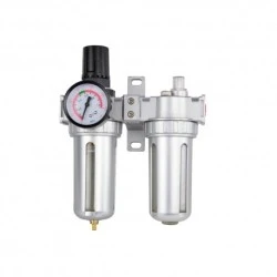 Reduktor z filtrem powietrza i odwadniacz 1/4" ⭐⭐⭐⭐⭐ ➡️ 2 elementowy reduktor z filtrem powietrza i smarowaniem. Reduktor z filtrem służy do utrzymania stałego ciśnienia roboczego niezbędnego do poprawnego działania m.in. pistoletów lakierniczych, kluczy udarowych, szlifierek itp. Dodatkowo urządzenie filtruje, odwadnia, odoleja i separuje wszelkie zanieczyszczenia. Idealny do narzędzi wymagających smarowania. Wydajna smarownica naoliwia narzędzie podczas pracy. Filtr powietrza filtruje powietrze z kropel wody, zapobiegając powstawaniu zacieków podczas malowania jak również korozji narzędzi. ➡️ Cechy produktu: ✔️ idealny do narzędzi wymagających smarowania, ✔️ ręczny spust kondensatu, ✔️ wkład filtracyjny 40 mikronów, ✔️ regulacja intensywności smarowania, ✔️ zbiornik z poliwęglanu, ✔️ maksymalne ciśnienie pracy 1 MPa. ➡️ Dane techniczne: ✔️ maksymalne ciśnienie pracy: 1 MPa, ✔️ średnica gwintu przyłącza powietrza: 1/4", ✔️ maksymalna temperatura pracy: 60°C, ✔️ materiał zbiornika: poliwęglan, ✔️ zalecany olej: ISO - VG32, ✔️ zakres regulacji ciśnienia: 0,5 - 10 bar, ✔️ maksymalny przepływ: przy ciśnieniu 6 bar - 1200 litrów/min.