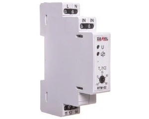 Regulator temperatury RTM-02 służy do sterowania odbiornikami (np. grzejniki, ogrzewanie podłogowe, systemy antyoblodzeniowe) w zależności od temperatury panującej w otoczeniu zewnętrznego czujnika NTC. Urządzenie posiada możliwość regulacji temperatury zadanej za pomocą potencjometru znajdującego się na panelu przednim w zakresie -10 oC ÷ +40 oC. Do poprawnej pracy urządzenie wymaga podłączenia zewnętrznej sondy NTC-03. Sonda nie występuje w komplecie z regulatorem i należy nabyć ją oddzielnie. Przewód sondy ma 3 m długości i można go przedłużyć do 50 m przewodem o przekroju 0,2 ÷ 2,50 mm2. Sond nie można łączyć.