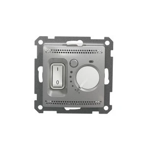 Regulator temperatury 2-biegunowy (16A), srebrne aluminium, to osprzęt serii Sedna Design & Elements marki Schneider Electric. Regulator temperatury ma malowane wykończenie powierzchni w kolorze srebrnego aluminium i posiada następujące wymiary: szerokość 71 mm, wysokoś ć 71 mm, głębokość 47 mm, głębokość wystawania 14.4 mm. Długość izolacji zdejmowanej z kabla to 8 mm. Regulator charakteryzuje się stopniem ochrony IP20 i zakresem mocy wynoszącym 3600 W. Do produkcji regulatora wykorzystano tworzywo termoplastyczne o zwiększonej odporn ości na promieniowanie UV. Produkt jest montowany podtynkowo i posiada zaciski bezgwintowe. Uwaga: produkty Sedna Design & Elements nie są kompatybilne z serią Sedna!