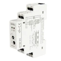 Regulator temperatury RTM-03 służy do sterowania odbiornikami (np. grzejniki, ogrzewanie podłogowe) w zależności od temperatury panującej w otoczeniu zewnętrznego czujnika NTC. Urządzenie posiada możliwość regulacji temperatury zadanej za pomocą potencjometru znajdującego się na panelu przednim w zakresie -10 ºC ÷ +90 ºC. Za pomocą drugiego potencjometru możliwy jest wybór jednej z 10 wartości histerezy z jaką ma działać regulator (od 0,25 ºC do 2,5 ºC). Do poprawnej pracy urządzenie wymaga podłączenia zewnętrznej sondy NTC-03. Sonda nie występuje w komplecie z regulatorem i należy nabyć ją oddzielnie. Przewód sondy ma 3 m długości i można go przedłużyć do 50 m przewodem o przekroju 0,2 ÷ 2,50 mm2. Sond nie można łączyć ze sobą.