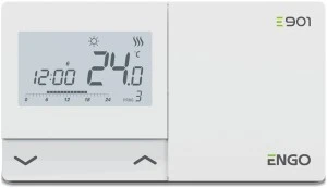 ENGO E901 to natynkowy, tygodniowy regulator pokojowy, służący do przewodowego sterowania urządzeniami oraz systemami grzewczymi lub chłodzącymi. Jego działanie polega na utrzymywaniu komfortowych warunków w pomieszczeniu, zgodnie z harmonogramami pracy lub nastawioną przez użytkownika stałą temperaturą. Podłącza się go bezpośrednio do urządzenia grzewczego.