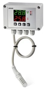dwuwierszowy odczyt cyfrowy LED o wysokości cyfr 14 mm z regulacją jasności świecenia: wyświetlacz GÓRNY - wilgotność ( %RH lub g/m3), DOLNY – temperatura (czujnika lub punktu rosy/szronu, °C ) lub wartość zadana wyjścia 1