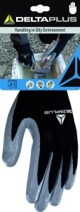 Rękawica z poliestru 100%. Powłoka nitrylowa na stronie chwytnej i końcach palców. Ścieg 13.